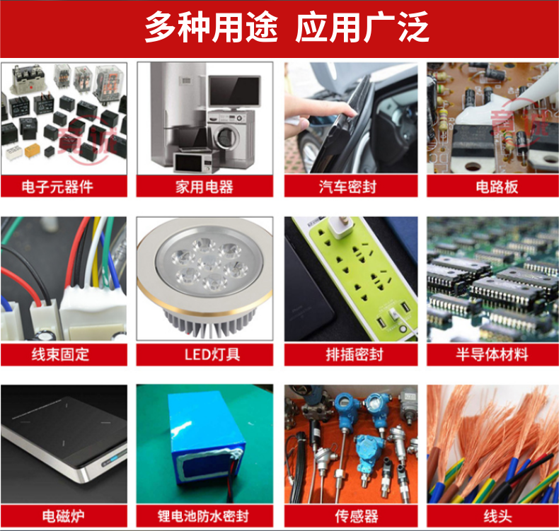 電子密封膠是廣泛的名稱(chēng),又稱(chēng)電子電器產(chǎn)品的粘合劑。主要用于電子展產(chǎn)品的粘貼、密封、封印、涂層、結(jié)構(gòu)粘貼、工行涂層和smt貼片等。